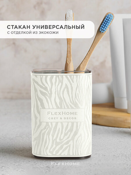 Настольный стакан FlexHome отличается удобством в применении и возможностью выбора для него любого места. Привлекательный дизайн аксессуара прекрасно дополнит ваш интерьер. Стильный стакан из пластика с наклейкой из экокожи можно использовать не только под зубные щетки, а также для полоскания полости рта, как подставку для карандашей, кистей для макияжа, расчесок, кисточек для рисования или прочих мелочей. Квадратная форма придает устойчивости при наполнении. Поэтому в стакан легко поместятся четыре зубные щетки, паста и еще останется место для гостей. Легко мыть, влагостойкая этикетка не деформируется. С нашими изделиями намного проще организовать пространство дома, на даче или в офисе.