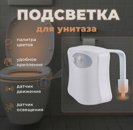 Подсветка для унитаза с датчиком движения – это не просто яркий дизайн, но и неоспоримая польза в быту. • несколько цветовых решений • автоматическое включение Как только вы зайдете в уборную, сработает встроенный датчик движения на устройстве и подсветка для унитаза включится. • НЕТ необходимости В лампочке Освещения от такого устройства вполне достаточно для обеспечения умеренного уровня света в ванной комнате, чего достаточно для использования унитаза по назначению. • стильный дизайн Вряд ли у кого-то из ваших друзей или родных уже есть такая подсветка. Удивите их таким современным дизайнерским решением, и ваша уборная запомнится им надолго, ведь это действительно красиво и необычно! Разработчики устройства предлагают вам сразу несколько цветовых решений для вашего туалета, которые с легкостью можно менять одним нажатием кнопки на приборе. В вашем распоряжении 8 цветов: красный, синий, зеленый, фиолетовый, желтый, оранжевый, голубой и белый. • простая установка Для этого достаточно закрепить светильник на унитазе с помощью гибкого держателя. Устройство надежно фиксируется за обод унитаза и может использоваться вместе с крышкой санузла. Благодаря гибкому креплению подсветка подходит для всех типов унитазов.