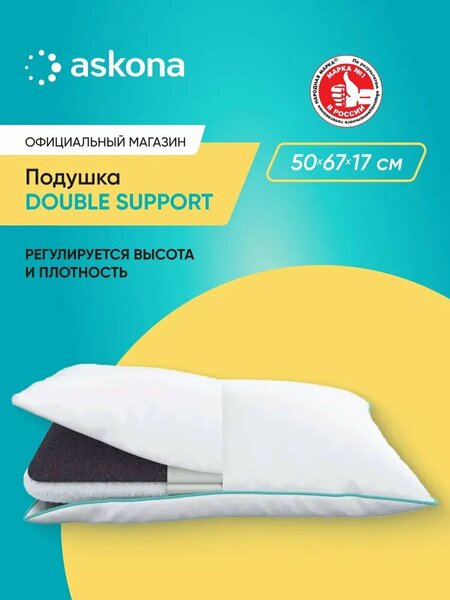 Расширенная гарантия 3 года при покупке с чехлом Askona. Подушка Double Support: двойная поддержка – для здорового сна! 1 сторона на основе пены с "памятью" формы с угольной пропиткой. Деликатно поддерживает голову и шею в анатомически правильном положении, нормализует кровообращение. Поглощает запахи, регулирует влажность и создает ощущение свежести. 2 сторона – набивная: из искусственного лебяжьего пуха и полиэфира. Придает подушке мягкость и легкость, улучшает воздухообмен. Набивной чехол из натурального хлопка создает комфортные условия для сна. Можно самостоятельно изменить высоту и плотность подушки за счёт извлечения из неё одного из наполнителей, которые находятся внутри подушки, каждый в индивидуальном внутреннем чехле, а также съёмного внешнего чехла. Double Support подходит для сна на спине и профилактики остеохондроза. Достоинства Double Support: