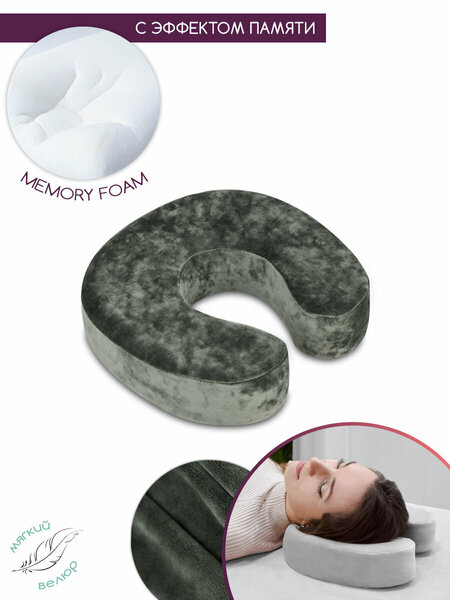 Подушка с памятью косметологическая под шею, подкова рогалик memory foam, для наращивания ресниц, оливковый