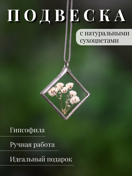 Вы ищете идеальный подарок для особенной женщины? Предлагаем вам уникальную бижутерию с подвеской на шею под серебро, вдохновленную нежностью и красотой сухоцветов. Этот модный аксессуар станет прекрасным подарком для вашей мамы, жены или учительницы. Наша бижутерия изготовлена из высококачественных материалов, чтобы подчеркнуть женскую красоту и элегантность. Серый шнурок создает эффектный контраст с серебряной подвеской в форме ромба, украшенной белыми цветами гипсофилы. Это настоящий гербарий, в основе которого настоящие засушенные цветы. Каждый элемент в этом украшении тщательно подобран, чтобы создать неповторимый образ. Эта изящная подвеска на шею станет прекрасным украшением для любого наряда. Ее стильный дизайн и элегантность подойдут как для повседневного образа, так и для особых случаев, таких как свадьба или новогодний вечер. Это идеальный аксессуар для любой девушки. Бижутерия на шею с натуральными засушенными цветами - это не только красивый аксессуар, но и символ любви и нежности. Подарите эту подвеску своей любимой женщине в день рождения, годовщину, Новый год, 8 марта или другой особый день. Она будет рада получить такой прекрасный подарок от вас. Не упустите возможность приобрести наш прекрасный кулон по такой привлекательной цене. Размер 2,5*2,5 см Серебряная рамка Полностью ручная работа, цветы расположены между двух стекол Рама не открывается Состав: засушенные цветы (гипсофила), стекло, олово, прочный шнурок Все изделия мы упаковываем очень бережно. На фото представлен образец изделия, Ваше изделие может немного отличаться от фото, так как это полностью ручная работа и все растения уникальны. Внимание! Изделие с гербарием необходимо беречь от прямых солнечных лучей, тогда цвет сохранится на долгие годы. Как ухаживать за украшениями: -Не оставлять на солнце; -Не надевать во время занятия спортом и не ложитесь в них спать; -Не принимать водные процедуры в украшениях; -Чистить мягкой тканью средством для мытья стекол; -Шнурок стирать в мыльной воде.