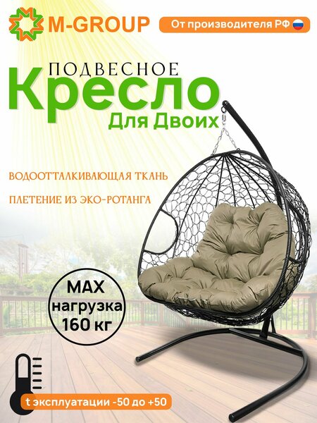 Подвесное кресло для двоих с ротангом чёрное, бежевая подушка
