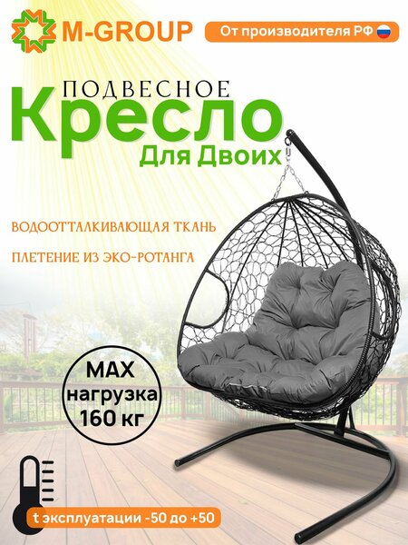 Подвесное кресло для двоих с ротангом чёрное, серая подушка