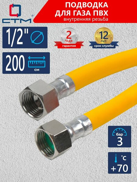 Подводка для газа ПВХ (шланг газовый армированный из ПВХ) длиной 200 см (2 метра) применяется для подачи сетевого или сжиженного газа к бытовым газовым приборам, газоиспользующим установкам и другому аналогичному газовому оборудованию. Шланг изготавливается из специальной поливинилхлоридной композиции (ПВХ), устойчивой к газу пентану, с концевой стальной арматурой с внутренней резьбой 1/2 дюйма. Для дополнительной прочности шланг армирован полиэфирной нитью. Подводка для газа ПВХ выполняет функции диэлектрика. При использовании данного шланга для подключения бытовых газовых приборов нет необходимости в использовании диэлектрической муфты (вставки).