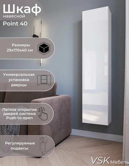 Лаконичный закрытый узкий подвесной шкаф Point 40 словно «парит» в воздухе, не перегружая пространство гостиной. Зрительно расширяет территорию, придавая легкость и воздушность. Размеры: 40х170х29 см (ШхВхГ) Фасад: МДФ 16мм, фрезерованная, пленка ПВХ . Цвет: Белый глянец. Корпус: ЛДСП 16мм . Цвет: белый. Четыре функциональные ниши за распашной дверцей Размеры ниши (мм): № 1 - 366 х 255 Высота 355 № 2; 3 - 366 х 255 Высота - 476 № 4 - 366 х 255 Высота - 344 Распашная стеклянная дверца открывается «на себя» и оснащена накладными петлями (4шт) с широким углом открывания 110 градусов. Петли без доводчиков. Универсальное открытие как в левую, так и в правую сторону обеспечивает легкое использование и размещение модуля. Надежные полки из ЛДСП - З шт . Размер полок: 366х24х16 (мм) Максимальная нагрузка: на полку - 3кг; на модуль - 19кг Крепление для навески на стену в комплекте Внимание! Саморезы (в зависимости от типа стен) для настенных креплений необходимо приобретать отдельно. Рекомендуем подписаться на наш магазин, что бы первыми узнавать о новинках и эксклюзивных акциях.