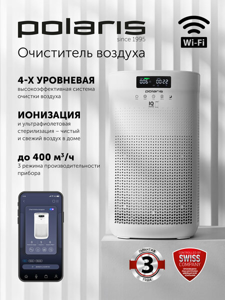 Очиститель воздуха для квартиры и дома Polaris PPA 4050 Wi-Fi IQ Home – это жизненно необходимая категория бытовой техники для тех, кто подвержен аллергии и заболеваниям верхних дыхательных путей. Благодаря высокой производительности 400 куб. м/ч и большому охвату площади работы до 48 кв. м, очиститель воздуха эффективно борется с пылью и аллергенами, минимизируя риск аллергии для людей чувствительных к загрязнениям. 4-х уровневая система фильтрации воздуха поможет защитить Вас и Ваших близких от крупных и мелких частиц пыли, бактерий, вирусов и аллергенов, обеспечивая дезинфекцию домашнего пространства. Данное устройство внедряет инновационные технологии в каждодневную жизнь абсолютно каждого члена семьи. Вы можете уверенно пользоваться данным очистителем 24/7 благодаря умному датчику контроля качества воздуха и индикации загрязнения. Очиститель воздуха Polaris PPA 4050 Wi-Fi IQ Home - находка для абсолютно каждой семьи в том числе с детьми и домашними животными. Встроенный ионизатор и ультрафиолетовая стерилизация воздуха в тандеме с угольным фильтром очистят, освежат и устранят резкие запахи в абсолютно каждом уголке Вашего уютного дома. Воздух будет свежим, чистым и насыщенным кислородом - это и есть залог здоровья абсолютно каждой семьи! Не стоит забывать про комфорт и безопасность самых маленьких жителей Вашего дома - детей. Использование данной модели очистителя воздуха Polaris абсолютно безопасно и комфортно за счет системы блокировки от детей и ночного режима, который сделает все чтобы не потревожить сладкий сон Вашего ребенка. Эта техника не оставит никого равнодушным и подчеркнет Вашу заботу о здоровье каждого члена Вашей семьи. Создавайте комфорт и уют Вашего дома вместе с техникой Polaris! Технические характеристики Количество скоростей воздушного потока: 3 Тип вилки EU Фильтр предварительный очистки; Электростатический HEPA-фильтр класса H13; Ионизатор; Угольный фильтр; Дезодорирующий фотокаталитический фильтр с высокой степенью эффективности; Датчик контроля качества воздуха; Индикация загрязнения воздуха; УФ стерилизация