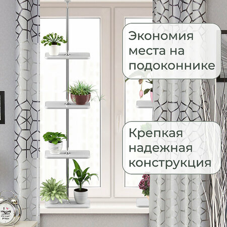 Габариты: Длинна: 39 см Ширина: 16 см Высота: согласно замеру Не требуется сверлить верхний откос и подоконник, что позволяет легко убрать или переместить подставку, ослабив распорный механизм. Подходит для окон с горизонтальными откосами (угол уклона не должен превышать 5 градусов). Распорная подставка для цветов на подоконник «Лиана-8» предназначена для размещения 8 кашпо. Изготовлена из ламинированной ДСП и стальной хромированной трубы диаметром 25 мм. Торцы полочек окантованы пластиковым профилем ПВХ, который служит бортиком и предотвращает соскальзывание горшка. В комплекте четыре полки, имеющие прямоугольную форму. Размер каждой полки 39х16 см. Рекомендуется использовать горшки объемом до 3 литров с диаметром основания до 15 см. Полки двухсторонние (верхняя и нижняя сторона лицевые). Нижняя полка служит устойчивым основанием и предотвращает повреждение подоконника. Остальные полки сквозные и при необходимости перемещаются по высоте и вращаются. В нужном положении надежно фиксируются с помощью 2 стопорных винтов. Такая подставка, несомненно, станет украшением любого окна.