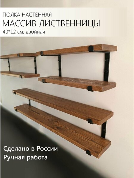 Полка настенная деревянная прямая из массива дерева лиственницы двойная для кухни, ванной, 12*40*17 см