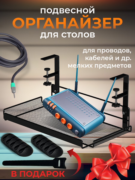 Подвесной органайзер для компьютерных и офисных столов позволяет уложить удлинитель, роутер, сетевой фильтр, пилот и собрать все провода на рабочем месте в одном компактном пространстве. Кабель менеджер позволит красиво уложить и подвести кабели, провода и шнуры к технике, не загромождая пространство компьютерного стола. Крепление органайзера для проводов располагается под столешницей и не мешает расположить стол вплотную к стене или окну.