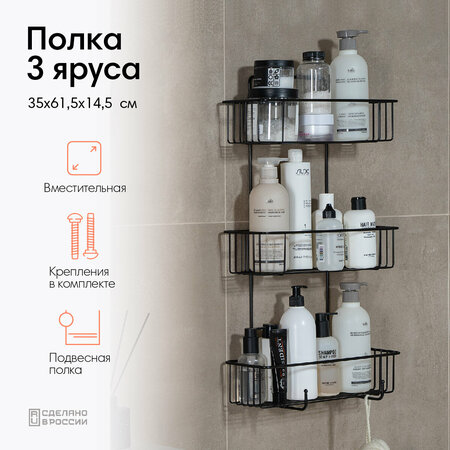 Трехъярусная полка настенная металлическая — идеальное решение для хранения! Представляем функциональную полку для ванной и кухни размером 35х14,5х61,5 см. Полка настенная навесная изготовлена из стали с полимерным покрытием черного цвета, обеспечивающим привлекательный внешний вид и защиту от влаги. Полка прямая для ванной и кухни имеет три секции и два крючка для полотенец, мочалок и других банных принадлежностей. Главные преимущества: - Прочность — металлическая настенная полка выдерживает нагрузку до 15 кг и не деформируется - Долговечность — полимерное покрытие обеспечивает стойкость к коррозии, а специальная добавка, входящая в состав краски, защищает от микроцарапин, благодаря чему полка надолго сохраняет декоративные и эксплуатационные свойства - Продуманная конструкция — увеличенный промежуток между ярусами и оптимальный размер полочек позволяет хранить предметы разной высоты и объёма, а высокий бортик и сетчатое дно предотвращают выпадение мелких вещей и не задерживают влагу - Функциональность — два крючка предоставляют дополнительное место для хранения, делая этот аксессуар для ванной незаменимым - Универсальность — черный цвет и стильный дизайн полки станет идеальным дополнением интерьера ванной комнаты или кухни, вписываясь в любой стиль оформления - Производство — сделано в России Технические характеристики: - Размеры: 35х14,5х61,5 см (ширина х глубина х высота) - Материал: сталь с полимерным покрытием - Цвет: черный - Количество ярусов: 3 - Количество крючков: 2 - Расстояние между секциями: 23,7 см - Максимальная нагрузка: 15 кг - Крепление: шурупы из нержавеющей стали в цвет изделия Не упустите возможность создать идеальное место для хранения вашей косметики и банных принадлежностей! Закажите полку настенную черную со сверлением уже сегодня и преобразите свою ванную комнату или кухню, используя доступное пространство максимально эффективно!