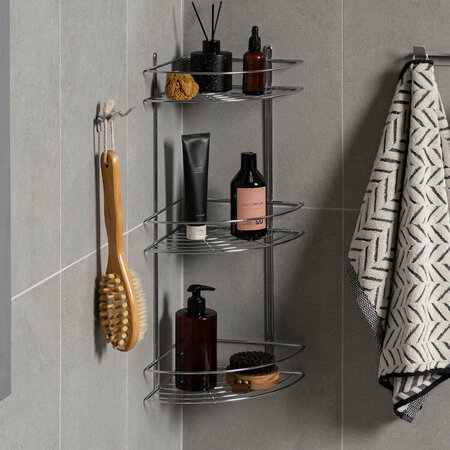 Угловая трехъярусная полка из стали с 3-слойным гальваническим покрытием. Изделие долговечное в эксплуатации и имеет стойкость к коррозии. Надежно крепится к поверхности при помощи саморезов, которые идут в комплекте. Расстояние между ярусами: 24 см. Расстояние от угла до крепления: 15 см. Высота бортиков: 5 см. Протирать с помощью мыльного раствора мягкой тряпкой. Не рекомендуется использовать абразивные и химически активные вещества для ухода за изделием. Состав металла: сталь Тип крепления: на шурупы При правильной установке максимальная нагрузка на ярус: 5 кг Крепления в комплекте 3-слоиное гальваническое покрытие для защиты от коррозии Толщина металлического прутка: 2 мм и 3,5 мм