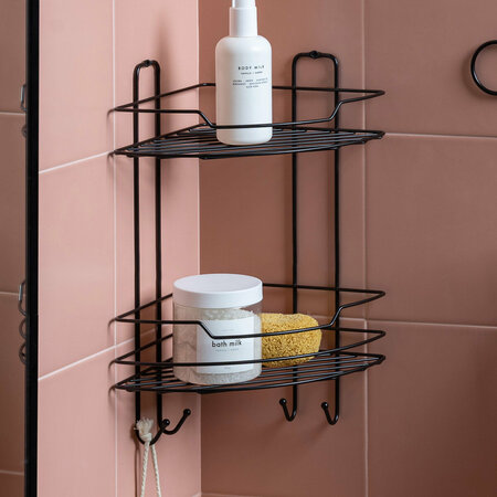 Угловая двухъярусная полка Лофт из стали с 4 крючками и полимерным покрытием черного цвета. На крючки удобно размещать щетки и мочалки для тела. Изделие долговечное в эксплуатации и устойчиво к механическим и химическим воздействиям. Надежно крепится к поверхности при помощи саморезов, которые идут в комплекте. Шляпки саморезов — в цвет изделия. Высота бортиков: 5 и 7,5 см. Расстояние между ярусами: 23,8 см. Является частью коллекции Лофт, которая представлена в Likemyhome в полном составе. Протирать с помощью мыльного раствора мягкой тряпкой. Не рекомендуется использовать абразивные и химически активные вещества для ухода за изделием. Состав металла: сталь Тип крепления: на шурупы Крепления из нержавеющей стали в комплекте Покрытие металла краской для защиты от коррозии Дополнительные крючки для хранения Толщина металлического прутка: 4,5 мм, 3,5 мм, 2,5 мм При правильной установке максимальная нагрузка на ярус: 5 кг