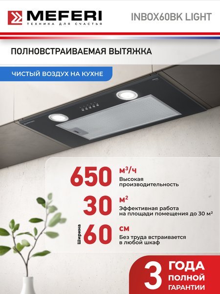 Полновстраиваемая вытяжка MEFERI INBOX60BK LIGHT - это идеальный выбор для тех, кто хочет создать уютную и комфортную атмосферу в своем доме. Эта вытяжка имеет стильный дизайн и легко впишется в любой интерьер. Кроме того, она обладает высокой производительностью и способна быстро очистить воздух от запахов. Вашему вниманию представлено 2 режима подключения на выбор. 1. Рециркуляция - вытяжка втягивает воздух, насыщенный запахами готовящейся пищи, а также молекулами жира, фильтрует его через угольный фильтр (приобретается отдельно) и возвращает в кухню. 2. Отвод - при работе устройства в режиме отвода воздуха, весь грязный воздух удаляется из кухни через стационарный вентиляционный канал. Одним из преимуществ является наличие трех скоростей работы. Это позволяет выбрать оптимальный режим для различных задач. Например, для приготовления пищи на небольшой плите можно использовать первую скорость, а для больших плит и духовых шкафов - вторую и третью. Кроме того, эта вытяжка оснащена светодиодными лампами, которые обеспечивают яркое и равномерное освещение рабочей поверхности. В целом, полновстраиваемая вытяжка MEFERI INBOX60BK LIGHT является отличным выбором для тех, кто ценит удобство и комфорт в использовании техники. Она обладает высокой производительностью, стильным дизайном и множеством полезных функций, которые делают ее незаменимым помощником на кухне.
