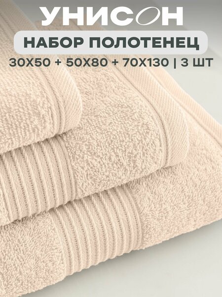 Набор махровых полотенец (3 шт) создан для тех, кто выбирает для себя комфорт и наслаждение. Мягкие полотенца из махры (100% хлопок) отлично впитывают влагу: плотность банных аксессуаров составляет 400 г/м2. Нежные и пушистые полотенца приятно ощущаются телом, поэтому вы будете наслаждаться банными процедурами. А качественное плетение гарантирует целостность полотенец в течение долгого времени. Подарочный комплект включает большое банное полотенце (70х130 см), а также среднее (50х80 см) и маленькое (30х50 см). Первым удобно вытереть тело, вторым — - волосы, а третье подойдет для лица или рук. В набор входят бежевые полотенца с лаконичным бордюром снизу. Махровые полотенца бежевого цвета в оттенке мокко красиво сочетаются друг с другом и легко подойдут к интерьеру вашего дома. Их можно задействовать и как мужские, и как женские полотенца. Именно поэтому они просто идеальны для пары. Банные полотенца из махры для него и для нее приятно использовать после душа или ванной. Их также можно взять с собой в бассейн и на спа-процедуры, а еще в пляжный отпуск, баню или в спортзал. Большое и маленькое домашние полотенца отлично сохраняют расцветку и не оставляют следов ворса, что говорит об их высоком качестве. Именно поэтому банные полотенца можно приобрести не только для себя, но и как символический подарок близким — например, папе или маме — на день рождения, новоселье и другие праздники. Бабушка и дедушка также будут в восторге от качественных однотонных полотенец! Сестра и брат, или близкие друг и подруга смогут использовать их хоть каждый день. А еще красивые махровые полотенца порадуют парня и любимую девушку. Натуральный состав банных полотенец — причина, по которой они долго вам прослужат. Хлопковые полотенца не требуют сложного ухода и стираются в машинке на деликатном режиме. Для сохранения стойкого цвета и мягкости рекомендуется добавлять кондиционер для белья. Комплект махровых полотенец от бренда Унисон — лучший сюрприз для женщин и мужчин, которые любят качественные банные принадлежности и домашний текстиль. Унисон — искусство жить красиво.