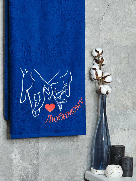 Полотенце махровое BIO-TEXTILES 70*140 с вышивкой любимому темно-синее для мужчины мужу папе брату сыну банное в подарок 100% хлопок подарок на 14 февраля Святое Валентина для парочек