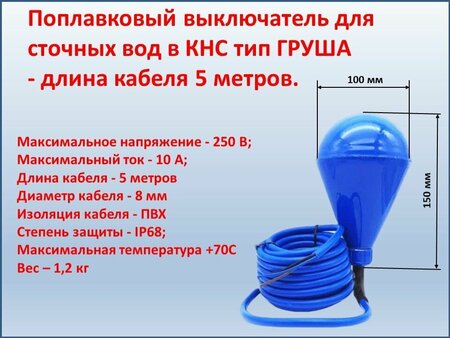 Поплавковый выключатель типа груша предназначен для контроля уровня жидкости в бассейне, колодце, резервуаре, септике, благодаря свой форме эффективно применяется в сильно загрязненных жидкостях, идеально подходит для КНС. Поплавковый выключатель груша предназначен для автоматического отключения/включения электронасоса при снижении/повышении уровня воды до заданного значения. Применяется для защиты от «сухого хода». Может использоваться для контроля наполнения или опорожнения емкостей (зависит от варианта электрического подключения). Характеристики поплавкового выключателя груша: Максимальное напряжение - 250 В; Максимальный ток - 10 А; Длина кабеля - 5 метров Диаметр кабеля - 8 мм Изоляция кабеля - ПВХ Степень защиты - IP68; Максимальная температура +70С