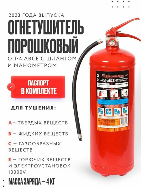 Предлагаем Вам огнетушитель ОП-4 (4 литра) 2024 года выпуска. Огнетушитель универсальный порошковый ОП-4 закачной класса АВСЕ. . Предназначен для оперативного тушения жидких (В) и газообразных (С) горючих веществ, а также электроустановок под напряжением до 1000 V (Е). Диапазон температур эксплуатации от -50 до +50 С. Вес порошка 4 кг. Порошковый огнетушитель предназначен для оперативного устранения очага возгорания. Мелкодисперсная минеральная пыль огнетушащего порошка перекрывает доступ к кислороду, практически моментально прекращая процесс горения. Огнетушитель особенно эффективен для локализации пожара на начальной стадии. Порошковый огнетушитель ОП-4 рекомендуется для оснащения квартир, домов, офисов, автомобилей и гаражей. Огнетушитель поставляется в коробке.