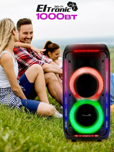 Портативная колонка Eltronic 30-71 с микрофоном и Bluetooth Eltronic 30-71 - это портативная колонка с двумя динамиками 8", которая обеспечивает мощность до 100 Вт и частотный диапазон от 50Hz до 20KHz. Она оснащена технологией TWS, что позволяет синхронизировать две колонки для создания стереозвука. Устройство поддерживает различные режимы воспроизведения: Bluetooth, FM, внешний накопитель и Aux. Bluetooth версии 5.0 обеспечивает стабильное соединение с устройствами на расстоянии до 10 метров. Eltronic 30-71 имеет встроенный аккумулятор на 12В 4.5А, что обеспечивает до 5 часов работы без подключения к сети. Также колонка оснащена удобной ручкой для переноски и разъемом для установки на штатив. В комплекте с колонкой идут беспроводной микрофон, пульт ДУ, инструкция и блок питания. Размеры упаковки составляют 40 см в ширину, 75 см в высоту и 34 см в глубину, а вес нетто - 12 кг. Дополнительно, колонка оснащена LED подсветкой, регулировкой громкости микрофона, дисплеем, приоритетом микрофона, регулировкой эхо микрофона и световыми эффектами.