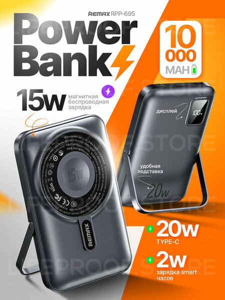 Портативный аккумулятор Remax RPP-695 10000mAh представляет собой многофункциональное устройство, которое обеспечивает быструю и безопасную зарядку ваших устройств. Аккумулятор емкостью 10000mAh позволяет заряжать совместимые устройства в течение всего дня. Благодаря функции быстрой зарядки PD мощностью 20 Вт, аккумулятор быстро заряжает ваши устройства. Беспроводное зарядное устройство позволяет заряжать Apple Watch (2W) или другие совместимые устройства (15W max) без необходимости подключения кабеля. Двойная зарядка: одновременно заряжайте два устройства, включая смартфон и умные часы. Складная подставка: встроенная складная подставка обеспечивает удобный угол обзора для просмотра видео в режиме громкой связи или видеозвонков. Цифровой дисплей: следите за временем зарядки вашего Power Bank. Совместимость с MagSafe: аккумулятор совместим с устройствами Apple, поддерживающими MagSafe. Защита от короткого замыкания, перегрузки и перегрева: аккумулятор оснащен многоуровневой системой защиты для безопасной зарядки ваших устройств. Портативный аккумулятор Remax RPP-695 10000mAh выполнен из качественного ABS пластика и имеет стильный синий цвет. Вес аккумулятора составляет 195 грамм, а его размеры - 10x20x30 см. Технические характеристики: Емкость: 10,000mAh / 38.5Wh Вход Type-C / iPh: 5V/2.8A, 9V/2A, 12V/1.5A (Max 18W) Выход Type-C: 5V/3A, 9V/2.22A, 12V/1.67A, 10V/2.25A (Max 22.5W) Беспроводная зарядка: 5W/7.5W/10W/15W (Phone), 2W (Watch) Материал: ABS+PC Размер: 108.7 x 70.8 x 20.7мм Вес: 205г