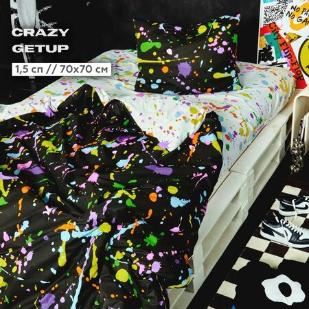 Crazy Getup создаёт постельное белье для таких как ты – активных, выделяющихся, на стиле. Никаких банальных пони или самолетов. Только то, что в тренде и актуально прямо сейчас. Новый взгляд на символику и атрибутику неформальных движений дизайнеры оригинально перенесли на ткань, создав комплект постельного белья, который подойдет для детей, взрослых и подростков. Постельное белье 1,5 спальное Crazy Getup - это стильный и яркий комплект, который просто излучают энергию и веселье. Это именно то, что нужно для ярких и добрых снов! Этот позитивный комплект постельного белья идеально впишется в комнату подростка, подчеркнув его креативность и индивидуальность! Детское постельное белье 1,5 спальное Crazy Getup помогает засыпать и видеть крэйзи сны. Абсолютно все наши комплекты для творческих, нестандартных личностей, которые не любят и не хотят жить в рамках. Создавай пространство вокруг себя таким, каким ты хочешь. Оформляй спальню ярко! А теперь немного важной информации: Комплект постельного белья 1,5 спальный выполнен из 100% натурального хлопка - ткани перкаль, что обеспечивает долговечность и неприхотливость в уходе. ---------------------------------------------------------------------------------- Комплект включает в себя ✓ одну классическую простынь размером 150х220 см, ✓ один пододеяльник с клапаном размером 215х143 см, ✓ одну наволочку 70х70 см с клапаном. ✓ Плотность ткани составляет 110 г/м2. ---------------------------------------------------------------------------------- Все красители яркие, стойкие и сертифицированы по всем необходимым стандартам качества. Уход за постельным бельем прост: достаточно стирать при температуре не выше 40 градусов и не использовать отбеливатели. Преимущества постельного белья из перкаля: мягкость, гладкость и шелковистость ткани, которая холодит в жару и согревает в холода; минимальная усадка при стирке, не подвержено образованию катышков; текстиль для дома. Выбирая постельное белье Crazy Getup, вы получаете качественный и стильный продукт, который прослужит вам долго и подарит яркие и добрые сны.