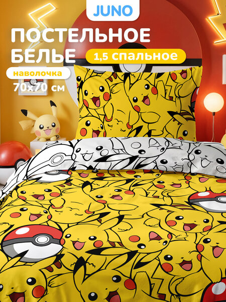 Хотите преобразить детскую и обрадовать ребенка? Пора приобрести новое детское 1,5 спальное постельное белье! С суперским комплектом-полуторкой от Juno интерьер заиграет новыми красками, а детская комната – и, дома, и на даче — станет еще эстетичнее и уютнее, чем прежде. Электрический покемон Пикачу, которого знают и любят дети во всем мире, молниеносно наполнит комнату энергией и позитивом. Постельное белье с ярко-желтым героем из популярного аниме Pokemon задаст жизнерадостное настроение на весь день. Карманный монстр заполонил с собой чёрно-белую простынь и пододеяльник, монохромный с одной стороны и ярко-жёлтый - с другой. Такой контраст делает комплект ещё ярче и при этом - уравновешивает насыщенные цвета. Постельное белье с красивым принтом идеально подойдет на односпальную кровать с матрасом 80х180, 90х180, 90х190, а также 80х200 см, 90х200 см. Хлопковый комплект включает: пододеяльник 215х143 см, простынь 214х150 см и наволочку 70х70 см. 1,5 спальное постельное белье, сделанное из нежнейшего поплина (ткань 100% хлопок) — выбор в пользу комфорта вашего любимого ребенка и летом, и зимой. Он будет быстро и с удовольствием засыпать на сказочно-мягком односпальном постельном белье, которое отлично сохраняет милый рисунок. Полутороспальное постельное белье на одноместную кровать из поплина подарит детям самые приятные сны. Такой хб набор порадует мальчика или девочку в день рождения. Мягкое полуторное постельное белье — отличная покупка в детскую и оригинальная идея подарка по любому поводу: например, в честь новоселья! Это лучший подарок для дочки и сына, внука или внучки, а также друга и подруги вашего ребенка. Комплект на полутороспальную кровать также осчастливит крестника и крестницу. За качественным полутороспальным комплектом нетрудно ухаживать: он стирается в машинке на деликатном режиме (40 С). Перед стиркой выверните КПБ наизнанку, чтобы лучше сохранить рисунок, и используйте щадящие средства. Прикольное постельное белье 1.5 спальное производится в Иваново, России, по высоким стандартам качества и безопасности. Родители могут быть спокойны за своих детей: теперь они будут крепко и сладко спать по ночам на мягкой постели. Обратите внимание, что постельное белье 1 5 для ребенка является невозвратным товаром. Просьба проверять спальные комплекты и постельные принадлежности на целостность, не покидая пункт выдачи. Приятных покупок и пусть Ивановский текстиль всегда радует вас. Мы знаем, о чем мечтают дети!