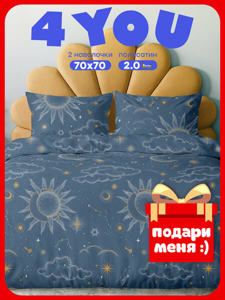 Хочешь преобразить свой уголок и окружить себя уютом? Постельное белье 2 спальное от 4YOU by Crazy Getup со стильным дизайном — лучшая покупка для твоей комнаты! Постельное белье с космическим дизайном позволит тебе улететь в приятные сны! Принт с золотистыми солнцем, луной и звездами суперски смотрится на темно-синем постельном белье. Детализированные рисунки с небесными телами придутся по вкусу мечтателям и любителям астрологии, которые верят в волшебные предсказания. В набор постельного белья (макси) входят: две наволочки размером 70х70 см, а также простынь 200х220 см и пододеяльник 175х215 см. Постельное белье 2 спальное 70х70 идеально подойдет на большую подростковую кровать или в комнату взрослых. Двухспальное постельное белье из полисатина (100% п/э) не линяет и отлично сохраняет рисунок. Мягкий комплект из гладкой ткани также хорошо держит форму. Красивое и качественное постельное белье из полисатина — отличный подарок девочке и мальчику подростку! Стильный комплект постельного белья спального 2 можно также подарить друзьям на новоселье. Любимые подруга и сестра будут счастливы получить двуспальное постельное белье с необычным принтом на день рождения! 2 спальное постельное белье с милым дизайном по приятной стоимости — настоящая находка для девушки или парня, которые ценят крепкий и хороший сон, а также — хорошая покупка в подростковую комнату. За подарочным комплектом из полисатина легко ухаживать: он стирается в машинке на деликатном режиме (40C). Перед стиркой выверни постельное белье 2 спальное наизнанку, чтобы лучше сохранился рисунок. Постельное белье 2 спальное от нашего бренда, сделанное в Иваново, России, порадует высоким качеством и поможет создать уют у тебя в спальне. Комплект представлен в красивой подарочной упаковке. Обратите внимание, что Ивановский текстиль является невозвратным товаром для дома: просьба проверять постельное белье — комплект из полисатина — непосредственно на пункте выдачи заказов. Будь в тренде и следи за нашими новинками, скидками и акциями.