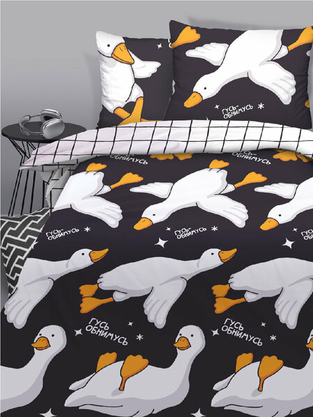 Комплект двуспального постельного белья для дома из хлопковой ткани от Ивановского бренда Твой Стиль! Материал – Бязь, 100% хлопок. Плотность ткани 120 г/кв. м. КПБ, выполненный в стильных цветах. Подростковое постельное белье 2 спальное Твой стиль - крутой подарок на день рождения. Черный – основа гаммы именно этой постельки. Такой аксессуар создаст уникальный молодежный современный стиль комнаты и интерьера. Хлопковый кпб размера полуторка станет находкой для детской и подростковой спальни. Принт, который понравится, как детям, так и подросткам, и даже взрослым. Купите в Для Нее. и Для Него. Это двуспальный комплект в постель для ярких и мечтательных подростков, молодежи, детей, взрослых, кому нравятся такие принты как акула икея, гусь обнимусь, совушки, с гусем, с цветами и другие тренды. Универсальный подарок для молодежи на день рождения или новоселье, свадьбу молодоженам, годовщину, именины. Комплект, который подойдет и для квартиры, и для дачи. Это не детский комплект постельного белья, это – минималистичный, монохром и крейзи crazy муд. Хайповый домашний комплект, предметы которого пропитаны трендами и дерзким настроением. 2-спальный комплект постельного белья для тех, кто выбирает стильный домашний текстиль! Компания ТДЛ Текстиль из Иваново представляет наборы вещей для сна и товары из качественного материала, которые прослужат долгие годы. Наш Ивановский текстиль это собственное производство и безопасный выбор. В набор входят постельные принадлежности: пододеяльник 175х215 см, простынь 216х240 см и 2 наволочки 70х70 см.