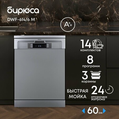 Посудомоечная машина 60 см Бирюса DWF-614/6 M, 14 комплектов, 3 корзины, дисплей, дополнительная сушка, серебристый