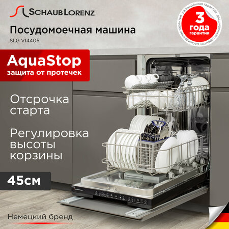 Встраиваемая посудомоечная машина Schaub Lorenz SLG VI4405: эффективное решение для мытья посуды Вместительность и функциональность Встраиваемая посудомоечная машина Schaub Lorenz SLG VI4405 предлагает 9 комплектов посуды, что делает ее подходящей для использования в домах и квартирах с различным количеством посуды. Модель оснащена экономичными и эффективными программами, включая режим половинной загрузки и предварительное ополаскивание/замачивание, что позволяет экономить ресурсы и воду. Удобное управление и отложенный старт Электронное управление позволяет выбрать одну из 5 программ мойки, адаптируя машину под ваши нужды. Функция отложенного старта позволяет настроить запуск машины на удобное для вас время, а индикаторы наличия ополаскивателя и соли облегчают процесс использования. Безопасность и экономичность Безопасность использования обеспечивается благодаря защите от перегрева и частичным шлангам защиты от протечек. Класс энергопотребления A++ и расход воды 10 литров на цикл делают эту модель экономичной и экологичной. Компактный дизайн и встраиваемая конструкция Компактный дизайн и встраиваемая конструкция позволяют легко интегрировать посудомоечную машину в любой кухонный интерьер. Ширина составляет всего 44,8 см, что делает ее узкой и практичной для небольших кухонь. Индикация работы и комплектация Звуковая индикация работы и корзина для столовых приборов входят в комплект поставки. Технические характеристики: - Вместимость: 9.0 комплектов - Вид: узкая - Тип установки: встраиваемая полностью - Класс энергопотребления: A++ - Ширина: 44.8 см - Программы: экономичная, режим половинной загрузки, интенсивная, предварительное ополаскивание/замачивание - Цвет товара: черный - Класс сушки: A - Высота: 81.5 см - Глубина: 55.8 см - Вес: 30.5 кг - Максимальная потребляемая мощность: 1850.0 Вт - Энергопотребление за цикл: 0.682 кВтч - Уровень шума при работе: 49 дБ - Количество программ мойки: 5 - Количество температурных режимов: 2 - Время мойки при обычной программе: 238 мин - Индикаторы: наличия ополаскивателя, наличия соли - Особенности: использование средств 3 в 1 - Минимальное время отсрочки запуска: 3 мин - Максимальное время отсрочки запуска: 9 мин - Макс. температура воды на входе