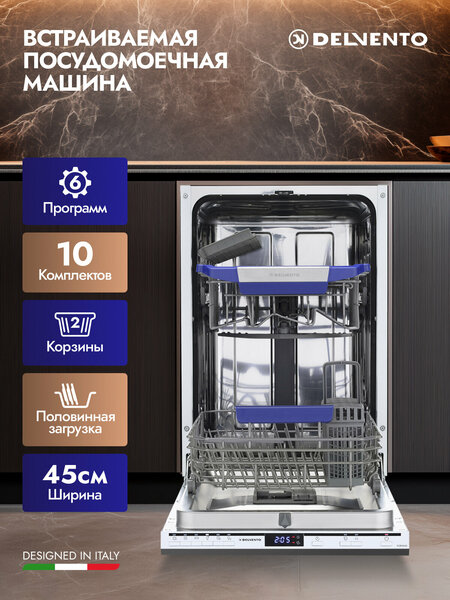 Встраиваемая посудомоечная машина Delvento - это идеальное решение для тех, кто ценит свое время и хочет освободить его для более важных дел. Эта посудомоечная машина шириной всего 45 см идеально подойдет для небольших кухонь или для тех, кому не хватает места для большой машины. Delvento имеет высоту 81,5 см, ширину 44,8 см и глубину 55 см. Вмещает 10 комплектов посуды, что позволяет мыть посуду быстро и эффективно. Эта посудомоечная машина оснащена современным инверторным двигателем, который обеспечивает тихую работу и экономию электроэнергии. Кроме того, Delvento имеет функцию отложенного старта, что позволяет запускать машину в удобное для вас время. Преимущества Delvento включают в себя: - Компактные размеры, которые позволяют сэкономить место на кухне. - Тихая работа, которая не будет мешать вашей семье или соседям. - Экономичность, так как Delvento использует меньше воды и энергии, чем обычные посудомоечные машины. - Функция отложенного старта позволяет запускать машину, когда вам удобно. - Современный инверторный двигатель обеспечивает тихую и эффективную работу. - Delvento также имеет широкий выбор программ мойки, включая быструю и интенсивную мойку, что позволяет выбрать оптимальный режим для любого типа посуды. В целом, Delvento - это отличное решение для тех, кто ищет компактную и эффективную посудомоечную машину. Она позволит вам экономить время и энергию, а также обеспечит чистоту вашей посуды.