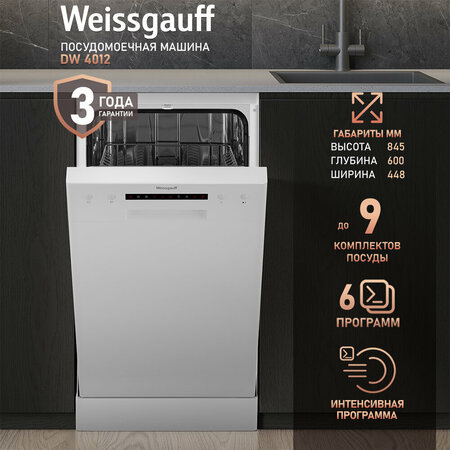 Отдельно стоящая посудомоечная машина Weissgauff с полностью электронным управлением, вместимостью посуды до 9 комплектов и вертикальной регулировкой средней корзины - это не только экономия места на кухне, но и отличное качество мытья вашей посуды. До 9 комплектов посуды одновременно вы можете расположить в данной посудомоечной машине, благодаря современным продуманным и эргономичный корзинам, которыми Weissgauff оснастили эту модель Половинная загрузка, благодаря которой вы сможете помыть даже самое небольшое количество посуды, не расходуя воду и электричество больше, чем это необходимо. Режим "Стекло", прекрасно подойдет для стеклянных стаканов, тарелок, бокалов, фужеров и прочего, обеспечивая одновременно бережное обращение с помещённой посудой и отсутствие разводов на стекле после завершения цикла мойки Режим "90 минут", это гарантия великолепного результата за четко определенный заранее срок! Интенсивная программа великолепно расправится даже с самыми сложными загрязнениями, гарантируя великолепный результат после каждого запуска! Экономичная программа подойдет для тех, кто хочет помыть посуду с низким уровнем загрязнений, не расходуя при этом излишне много воды! Стандартная программа подойдет для посуды среднего уровня загрязненности, в том числе, кастрюль, тарелок и бокалов! Вертикальная регулировка средней корзины по высоте, как в загруженном, так и в пустом состоянии, позволит вам буквально на лету изменять внутреннее пространство посудомоечной машины, размещая посуду наиболее эргономичным образом. Съемная верхняя крышка - позволяет также использовать вариант установки устройства под столешницу Возможность дозагрузки посуды, на начальном этапе мойки будет особенно удобна в случае, если вы забыли поместить в машину забытую на столе кастрюлю или тарелку! Полностью электронное управление, интуитивно понятное даже человеку, никогда ранее не работавшему с подобной техникой, сделает процесс запуска быстрым и лёгким.