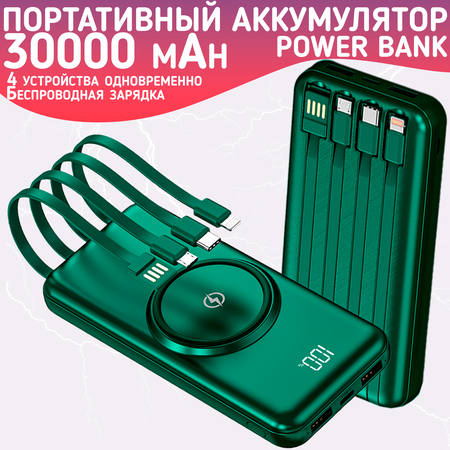 Повербанк 30000mAh, внешний аккумулятор с беспроводной зарядкой для iPhone и Android, Power Bank 4 провода, Зеленый