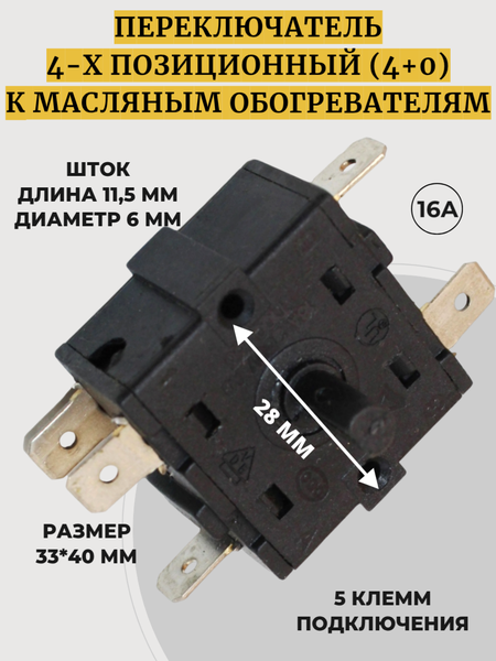Универсальный переключатель для масляных обогревателей 4-позиционный (5 клемм, 13А) Основные характеристики: Тип: поворотный переключатель Количество позиций: 4+0 Количество клемм подключения: 5 Максимальный ток: 13А Напряжение: 220-250В Материал корпуса: термостойкий пластик Режимы работы: По кругу не крутится. Через него идет сила тока. температурного режима нет Позиция 1: замкнуты контакты В+4 и 1+2+А Позиция 2: замкнуты контакты 1+2+А Позиция 3: все контакты разомкнуты (выключено) Позиция 4: замкнуты контакты 2+А Позиция 5: замкнуты контакты B+4 и 2+А Совместимость: Предназначен для большинства моделей масляных обогревателей различных производителей. Подходит для замены вышедших из строя переключателей в обогревателях. Особенности: Надежная конструкция с четкой фиксацией положений Усиленные контакты для долговечной работы Удобное подключение благодаря маркированным клеммам Безопасная эксплуатация при указанных параметрах Комплектация: Переключатель - 1 шт. Применение: Идеально подходит для ремонта и замены переключателей в масляных радиаторах, обеспечивая полный контроль над режимами работы обогревателя. Примечание: Перед установкой убедитесь в соответствии параметров переключателя характеристикам вашего обогревателя. Рекомендуется профессиональный монтаж.