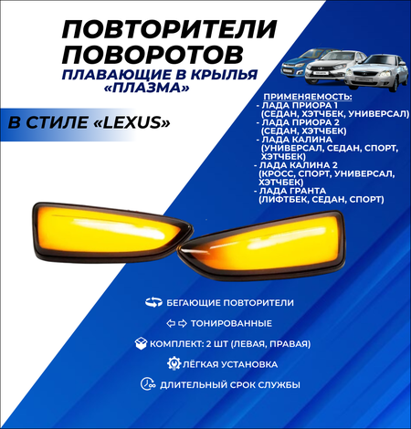 Повторители поворота Приора, Гранта, Калина, Калина 2 плавающие в крылья "Плазма" комплект 2шт. Многие автолюбители, чтобы улучшить внешний вид своей машины, тюнингуют свое авто светодиодными огнями. Одним из вариантов тюнинга является тонированные бегающие повторители поворота в стиле Лексус, которые обращают внимание на себя других участников движения. Установка и подключение производится вместо штатного в родное посадочное место. Светодиодные повторители поворота имеют функцию бегающего поворотника.