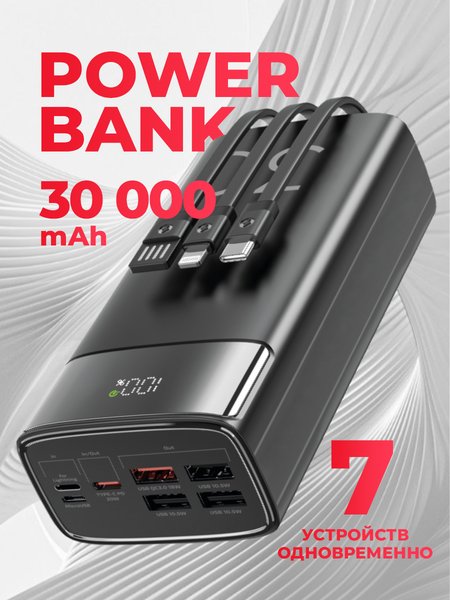 Достоинства:Не могу согласиться с негативным отзывом о повербанке на 30000 mAh. У меня он работает отлично — быстро заряжает устройства и держит заряд долго. Возможно, у другого пользователя возникли проблемы с подключением или кабелем. Недостатки:Их нет Комментарий:Внешний вид и характеристики впечатляют: три встроенных кабеля очень удобны, а быстрая зарядка действительно экономит время. Я доволен покупкой и рекомендую этот повербанк всем, кто нуждается в надежном источнике питания!
