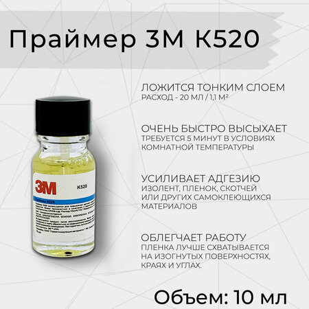 Праймер 3М K520 - усилитель адгезии. Представляет собой прозрачную жидкость с резким запахом. Основное предназначение праймера – усиление клеевого эффекта пленок, скотчей или других самоклеющихся материалов. праймер К520 сильно испаряется В открытом виде. Желательно использовать весь пузырек при работе. Праймер K520 – незаменимый помощник при оклейке автомобиля виниловой пленкой! Все пленки для стайлинга авто имеют самоклеящуюся основу, это знает каждый. Зачем же тогда праймер, спросите Вы! При наклеивании пленки на изогнутые поверхности она сильно растягивается, её клеевой слой так же тянется и утончается, пленке надо помочь удержаться на оклеиваемой поверхности в сложных условиях, для этого и нужен Праймер 3М! Особенно это необходимо при оклейке вогнутых поверхностей. Предварительно промазав праймером обклеиваемую поверхность, мы перестраховываемся от повторной работы на таких сложных участках как ребра жесткости капота с вогнутым профилем, сложно-вогнутых бамперов, местах, где одного клея бывает недостаточно. Следует помнить, что на краях деталей пленка любит отклеиваться, а в углублениях – вздуваться, именно поэтому желательно применять праймер. Описание продукта: Праймер 3M K520 может быть использован для повышения адгезии к таким поверхностям как полиэтилен, полипропилен, ABS, сочетание PET/PBT, бетон, дерево, стекло, металл и окрашенные металлические поверхности. Прозрачный янтарный цвет, расход - 14 мл /0,2 кв. м, высыхает до глянцевого покрытия. Подготовка поверхности: Поверхность, на которую наносится Праймер ЗМ K520, должна быть чистой и сухой. Для очистки загрязненной поверхности рекомендуется использовать смесь изопропилового спирта с водой в пропорции 1:1. Применение: Перед применением Праймер ЗМ K520 необходимо хорошо встряхнуть, затем нанесите тонкий однородный слой на оклеиваемую поверхность, используя минимальное количество необходимое для равномерного покрытия. Дайте время составу высохнуть, перед тем как произвести оклейку. Обычно для этого требуется 5 минут в условиях комнатной температуры. Убедитесь, что поверхность, на которую наносится Праймер, свободна от загрязнений и пыли. Для пористых поверхностей может потребоваться повторное нанесение состава для достижения однородности покрытия поверхности и хорошей адгезии. В этом случае необходимо дать высохнуть первому слою и лишь затем наносить второй.
