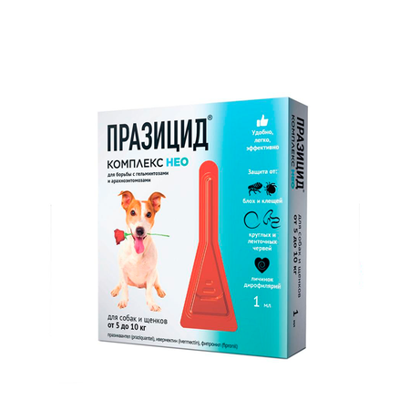Препарат наносят на кожу животному, раздвинув шерсть, в места, недоступные для слизывания (в области шеи у основания черепа или между лопатками); при обработке крупных животных препарат наносят в 3-4 места. В зависимости от вида и массы животного используют Празицид-комплекс НЕО различной фасовки в дозах, указанных в таблице. Таблица Масса животного / Объем препарата на животное / Количество пипеток Собаки и щенки до 5 кг 0,5 мл пипетка Собаки и щенки от 5 до 10 кг мл 1 пипетка Собаки и щенки от 10 до 20 кг 2 мл 1 пипетка Собаки и щенки от 20 до 40 кг 4 мл 1 пипетка Собаки от 40 до 60 6 мл Комбинация пипеток Собаки от 60 до 80 кг* 8 мл Комбинация пипеток Кошки и котята до 4 кг 0,4 мл 1 пипетка Кошки от 4 до 8 кг 0,8 мл 1 пипетка Кошки от 8 до 12 кг** 1,2 мл Комбинация пипеток *Собакам весом от 40 до 60 кг дозировка препарата составляет 6 мл, что достигается комбинированием 2 пипеток объемом 2 и 4 мл, для собак весом от 60 до 80 кг необходимо 2 пипетки по 4 мл. **Кошкам от 8 до 12 кг дозировка препарата составляет 1,2 мл, что достигается комбинированием 2 пипеток объемом 0,4 и 0,8 мл. Для уничтожения блох, вшей, власоедов, защиты животных от нападения иксодовых клещей и профилактики дирофиляриоза обработку животных препаратом Празицид-комплекс НЕО проводят один раз в месяц на протяжении всего сезона активности насекомых. Препарат применяют животным наружно, путем нанесения на сухую неповрежденную кожу. Для лечения отодектоза (ушной чесотки) препарат наносят на кожу однократно. В процессе лечения рекомендуется очищать слуховой проход от экссудата и струпьев, а в случае осложнения отитом — назначать противомикробные и противовоспалительные средства. При саркоптозе, нотоэдрозе и демодекозе лекарственный препарат наносят тампоном на предварительно очищенные от струпьев пораженные участки тела от периферии к центру с захватом пограничной здоровой кожи до 1 см, в дозах, указанных в таблице. Обработку проводят 2-4 раза с интервалом 10-14 дней до клинического выздоровления животного, которое подтверждают двумя отрицательными результатами акарологических исследований. Животных с обширными участками поражения обрабатывают в два приема с интервалом 1 день, нанося лекарственный препарат сначала на одну, а затем на другую половину пораженной поверхности тела. Лечение рекомендуется проводить комплексно с применением патогенетических и симптоматических средств согласно инструкциям по их применению. Для дегельминтизации животных при нематодозах и цестодозах препарат применяют с лечебной целью однократно, с профилактической - один раз в квартал в дозах, указанных в таблице. Для предотвращения слизывания препарата животному надевают шейный воротник, намордник или смыкают челюсти петлей из тесьмы, которые снимают через 20-30 минут после нанесения раствора. Особенностей действия лекарственного препарата при его первом применении и отмене не выявлено. В случае пропуска очередной обработки Празицид-комплекс НЕО его применение возобновляют в той же дозе и по той же схеме. Празицид-комплекс НЕО не предназначен для применения продуктивным животным