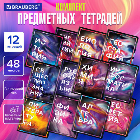 Предметные тетради 48 листов набор A5 в клетку и линейку 12 штук, глянцевая обложка с рисунком, Brauberg Liquid Marble, 404837