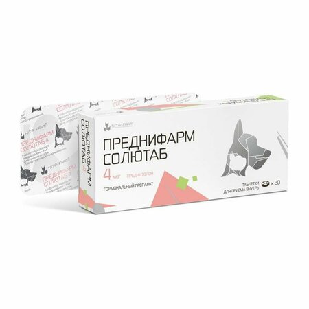 "Преднифарм Солютаб применяют кошкам и собакам перорально индивидуально, в смеси с кормом или в форме водной суспензии. Препарат назначают в суточных дозах: в качестве противовоспалительного средства (при воспалительных процессах различного генеза в том числе заболеваниях кожи, опорно-двигательного аппарата, острых инфекционных заболеваниях) 0,25–0,5 мг преднизолона на 1 кг массы тела животного; в качестве средства иммунорегуляции (в том числе для снятия сенсибилизации и зуда при заболеваниях кожи аутоиммунного генеза, аллергических и анафилактоидных реакциях, сывороточной болезни, аутоиммунной гемолитической и апластической анемии, тромбоцитопении, прогрессирующей офтальмопатии) и заместительной терапии при надпочечниковой недостаточности 0,5–2 мг преднизолона на 1 кг массы тела животного; в качестве цитостатического средства (при онкологических заболеваниях) 2–4 мг преднизолона на 1 кг массы тела животного. Доза препарата, кратность и продолжительность курса лечения устанавливается ветеринарным специалистом индивидуально в зависимости от показаний, тяжести заболевания и состояния животного. В некоторых случаях возможно длительное применение препарата. Для удобства задачи минимальной дозировки препарата животным с низкой массой тела возможно предварительно растворить таблетку или часть таблетки в небольшом количестве воды. Для этого таблетку или её части необходимо поместить в шприц соответствующей вместимости, предварительно вынув шток поршня. После чего вернуть шток на место и набрать воду. Периодически встряхивая шприц, выдержать 1–2 минуты до получения однородной смеси. В таком виде задают необходимую дозировку препарата перорально в форме суспензии с помощью шприца-дозатора или стандартного шприца для инъекций без иглы. Минимально необходимое количество воды для растворения 1 таблетки (или ее частей) для Преднифарм Солютаб 4 - от 2 мл. Наиболее удобным является применение Преднифарм Солютаб 4 животным массой тела - до 8 кг. Лекарственный препарат не предназначен для применения продуктивным животным."