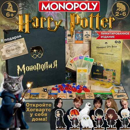 Настольная игра Монополия Гарри Поттер в деревянном подарочном боксе и билетик на Хогвартс-Экспресс - лучший подарок для детей и взрослых, который перенесет Вас в увлекательный мир Гарри Поттера. Лимитированное подарочное издание Monopoly Harry Potter позволит окунуться в волшебный мир Гарри Поттера и Хогвартса прямо у себя дома, ведь атмосфера Хогвартса входит в комплект. Покупайте и продавайте волшебные места, собирайте волшебные карты и прокачивайте свои магические способности. Только представьте, вы купите свою первую волшебную палочку в лавке Олливандера и отправитесь с платформы 9¾ вокзала «Кингс-Кросс» прямиком в "Хогсмид" Пройдете распределение у шляпы в Большом зале и побываете во всех самых знаковых местах мальчика, который выжилГлавное не попасться Дементору, чтобы тот не отправил в Азкабан! Монополия Гарри Поттера - это уникальная возможность собрать всю семью и друзей вокруг одного стола и провести вместе отлично время. Настольная игра Монополия Гарри Поттер подходит и для детей, и для взрослых, поэтому ее можно дарить не только девочкам, мальчикам, школьникам, любомой, жене, мужу, но и всей семье, друзьям, и даже коллегам. Премиальный Деревянный бокс, в котором представлена настольная игра Гарри Поттер, придает ей особый шарм и делает ее еще более привлекательной в качестве подарка. Монополия Harry Potter лучший подарок для поттерманов всех возрастов от 6 до 70 лет Цель Монополии Гарри Поттер - стать самым могущественным волшебником, развить свои королевства и волшебные земли с помощью магических кристаллов, заработав горы Галлеонов в волшебном мире, не попав к Дементорам в Азкабан! Одержать победу легко! Для этого вам не понадобится книга заклинаний или зельеваренья и волшебная палочка. В игре могут участвовать от 2 до 6 волшебников, но только один сможет стать самым могущественным! Главное, чтобы этим волшебником оказался именно ты! В полный комплект игры входит: ▪️ Плотное Игровое поле с матовой ламинацией 50х50 см ▪️ Эксклюзивные деревянные двухсторонние фигурки 6 шт. Фигурки, которые покоряют сердца всех поттерманов с первого взгляда! ▪️ Карточки Министерства 16 шт. ▪️ Карточки Выручай-комнаты 16 шт. ▪️ Карточки магической собсвтенности 28 шт. Все карточки выполнены из плотного картона с высококачественной печатью. ▪️ 32 волшебных кристалла и 12 магических камней ▪️ Комплект Галлеонов (игровых денег) ▪️ Обновленные правила на руском языке ▪️ Премиальный подарочный деревянный бокс Почему наша игра будет радовать Вас и Ваших близких долгое время: ▪️ Высокое качество изготовления каждого компонента игры; ▪️ Премиальная система хранения (кубики, карточки, фигурки и т. д. лежат в индивидуальных ячейках внутри бокса); ▪️ Прочная конструкция деревянного бокса; ▪️ Плотное игровое поле с матовой ламинацией, устойчивое к царапинам и приятное на ощупь; ▪️ Карточки бонусов и игровых денег (Галлеонов) напечатаны на высококачественном плотном материале; ▪️ Эксклюзивные деревянные фигурки с максимальной детализацией, у которых прорисована даже спинка! В состав фигурок входят: Гарри Поттер Рон Уизли Гермиона Грейнджер Северус Снейп Драко Малфой Букля Язык: русский Подарочная Монополия Гарри Поттер - лучший подарок ребенку, подростку на день рождения, для друга, для подруги, девушки, школьника, на новый год и рождество, дл