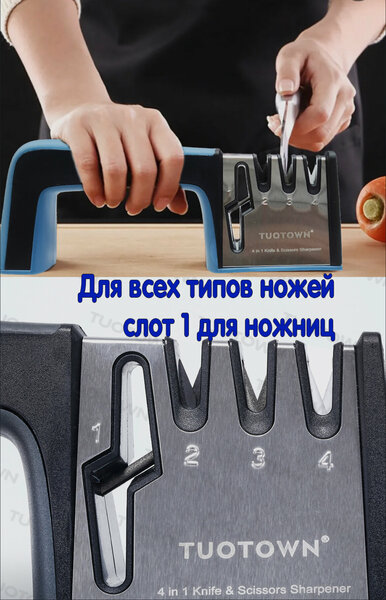 Точилка для ножей и ножниц. Универсальная ножеточка - необходимый аксессуар на каждой кухне, который вернёт былую остроту вашим ножам. Благодаря 4-м точильным элементам из керамики, вольфрамовой стали и алмазному абразивному краю вы придадите лезвиям чрезвычайную остроту за секунды. Отсеки позволяют точить и полировать не только ножи, но и лезвия ножниц. Нескользящая основа, эргономичный дизайн и комфортная ручка - залог удобства в использовании. Предназначение каждого слота: Слот 1: для заточки ножниц Слот 2: для заточки затупленных ножей Слот 3: для полировки и заточки режущего края Слот 4: этот слот имеет алмазный абразивный край для заточки без заусенцев Перестаньте избавляться от "тупых" ножей. Премиум ножеточка заточит даже тот нож, от которого вы решили избавиться!