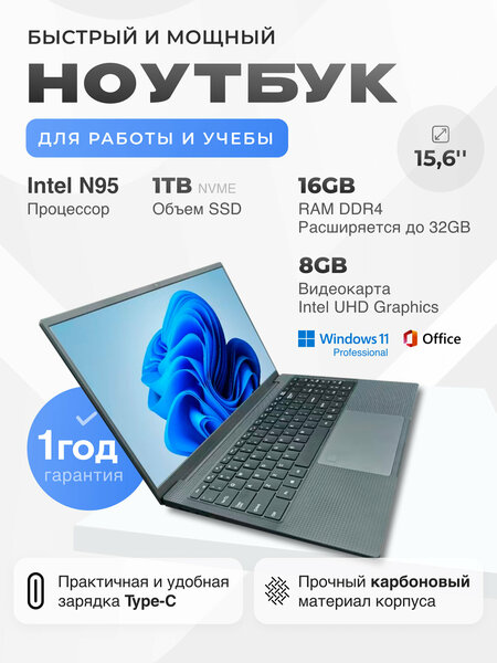 Ноутбук 15,6" Intel N95 16 ГБ DDR4 + 1 ТБ NVME – идеальный вариант для работы и учебы! Этот ноутбук – один из лучших в своем ценовом сегменте (до 50 000 ₽). Качество сборки, стильный дизайн и высокая производительность делают его отличным выбором для тех, кто ищет надежный laptop для повседневных задач, превосходя даже персональный компьютер в своем ценовом сегменте. Почему этот ноутбук стоит купить? ✔ Мощный процессор Intel N95 (4 ядра, до 3,4 ГГц) – обеспечивает плавную работу в Windows и любых приложениях. ✔ 16 ГБ оперативной памяти DDR4 (4800 МГц) – хватит для многозадачности, работы с графикой и даже легкого монтажа. ✔ Быстрый SSD NVMe 1 ТБ (до 3000 Мб/с) – мгновенная загрузка системы и программ, как на топовых ноутбуках. ✔ Яркий IPS FullHD-экран ноутбука с антибликовым покрытием – комфортная работа даже при ярком свете, без усталости глаз. ✔ Удобная клавиатура ноутбука с оптимальным ходом клавиш – печатать легко и приятно. Дополнительные преимущества: Два Type-C порта (под зарядку и периферию) – тренд современных ноутбуков. 3×USB 3.1, HDMI, microSD-слот – все для удобного подключения устройств. Сканер отпечатка пальца + шторка камеры – защита вашей конфиденциальности. Долгая автономность (5000 мА·ч) – ноутбук можно использовать долгое время без розетки или заряжать даже от powerbank. Готов к работе сразу – включая ноутбук, вы сразу увидите предустановленную на ноутбук Windows, а все драйвера для ноутбука уже настроены. Кому подойдет этот notebook? ✅ Для работы – офисные программы, браузеры, видеоконференции. ✅ Для учебы – написание рефератов, онлайн-курсы, скачать на ноутбук учебные материалы. ✅ Для путешествий – компактный, легкий, с отличной автономностью. ✅ Для игр - не смотря на встроенную видеокарту на нем можно комфортно играть в Мир танков, Genshin Impact, Майнкрафт. Комплектация: - Ноут - Зарядка (Type-C) - Гарантия 12 месяцев Если вы ищете ноутбук для работы, учебы или повседневных задач – этот вариант точно вас порадует, ведь мы заказываем лучшие ноутбуки с фабрик, где заказывают такие производители как Asus и HP!