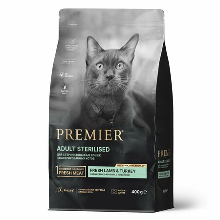 Premier Cat Sterilised корм для стерилизованных кошек и кастрированных котов Ягненок и индейка, 400 г.