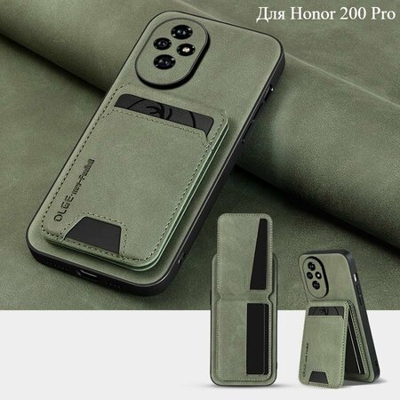 Премиум кожа чехол на Honor 200 Pro (Хонор 200 Про) с картхолдером, Противоударный чехол с защитой камеры и подставкой