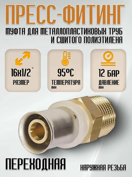 Муфта-пресс фитинг предназначена для соединения металлополимерных труб в системах холодного и горячего водоснабжения, а также отопления. Эта система пресс-фитингов обеспечивает быстрое и простое соединение, которое гарантирует высокую температуру рабочей среды и стойкость к давлению. Пресс-фитинги фиксируются с помощью специального зажимного инструмента, и процесс прессования заключается в механической деформации, обеспечивающей надежность. Корпус: горячепрессованная латунь ЛС58-2, Поверхностная обработка: пескоструйная обработка Уплотнительное кольцо: материал EPDM, Тип насадки инструмента: TH, Максимальное рабочее давление: 12 бар, Максимальная рабочая температура: 95 C, Резьба: ISO228, Пресс-фитинги не подлежат разборке. Указания по эксплуатации и техническому обслуживанию: Монтаж выполняется в соответствии с требованиями СП 40-102-2000, СП 41-102-98, СП 40-103-98 и СНиП 3.05.01-85. Перед установкой необходимо осмотреть изделие: при наличии повреждений, полученных в результате неправильной транспортировки или хранения, ввод в эксплуатацию запрещен. Следует подготовить трубу, провести калибровку внутренним калибром и снять фаску с внутреннего слоя стенки. Изделие не предназначено для применения в среде с агрессивными компонентами, пылью и газами, разрушающими металлы. Пресс-фитинг должен быть надежно закреплен на трубопроводе. Перед запуском обязательно провести гидравлические испытания и убедиться в отсутствии протечек в местах соединения. Допускается применение пресс-фитингов в системах прокладки трубопровода в бетонной стяжке. Эксплуатация с поврежденными уплотнительными кольцами или без них не разрешается.