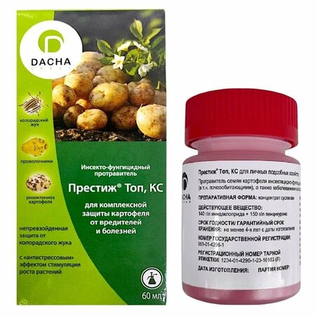 Комментарий:Отличное средство для предпосадочной обработки клубней картофеля. Пользуюсь не первый год. Жаль, что сейчас его стало так трудно купить из-за санкций. Действие заметно в течение нескольких недель с начала вегетации. Колорадские жуки с молодых побегов сразу падают замертво, кусты успевают набрать силу и загрубеть. Потом уже начинаем обрабатывать от жука другими средствами. Кроме прочего, Престиж отлично защищает растения от распространенных болячек.