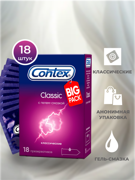 Презервативы Сontex Classic 18 шт. - гладкие. 18 классических презервативов Контекс Contex Classic (Классик) в силиконовой смазке. Бесцветные, прямой формы, с накопителем. Номинальные размеры: длина – 180 мм, ширина – 52 мм. Смазка не разрушает сперматозоиды. Изготовлены из натурального латекса. Проверено электроникой. Только для одноразового использования. Презервативы CONTEX являются средством предотвращения нежелательной беременности и и профилактики заболеваний, передающихся половым путем (зппп), в т. ч. ВИЧ-инфекции. Большая упаковка.