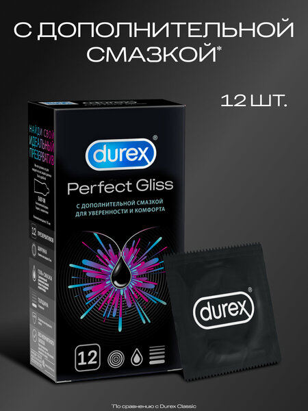 Durex Perfect Gliss (Дюрекс Перфект Глисс) c дополнительной смазкой для лучшего скольжения и большего увлажнения. Немного плотнее, чем наши стандартные презервативы, для тех, кому нужна дополнительная уверенность. Подходят для анального, орального и вагинального секса. Благодаря технологии производства не имеют неприятного запаха. Все предусмотрено для того, чтобы вы могли расслабиться и наслаждаться сексом. • Утолщенные* (для максимальной надежности); • Анатомической формы «EASY-ON»; • Гладкие, с накопителем; • Бесцветные, из натурального латекса; • C дополнительной силиконовой смазкой* для большего комфорта; • Без неприятного запаха; • Длина – 195 мм, ширина - 56 мм. Дерматологически протестированы. 100% проверены электроникой. Ни один из методов контрацепции не может гарантировать 100% защиты от нежелательной беременности, ВИЧ или иных заболеваний, передающихся половым путем. *По сравнению с презервативами Durex® Classic
