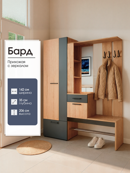 Набор мебели для прихожей Бард от бренда Пора Спать - является идеальным вариантом для хранения вещей в доме. Стенка для прихожей включает в себя секцию с сидением (мягкий элемент в комплект не входит) и ящиком, шкаф и тумбу с зеркалом. Прихожая является вместительной и удобной, Вы легко и быстро можете собраться при выходе из дома. Стенка в прихожей имеет сбалансированную конструкцию, доступную цену и разнообразие расцветок набора, что позволит Вам приобрести подходящую модель для помещения, оформленного в любом стиле. Идеальный вариант для тех, кто ищет долговечное и стильное решение для хранения своей одежды, аксессуаров и обуви в прихожей. Мебель выполнена из экологически чистых материалов высокого качества, что гарантирует надежную сохранность вещей в первозданном виде. Модель оборудована тумбами, ящиками и зеркалом для удобства примерки одежды и оценки внешнего вида. Ящики можно использовать как обувницы. Качественные материалы делают набор мебели для гостиной износостойким, способным прослужить многие годы - используется высококачественный безопасный ЛДСП - 16 мм. Благодаря данной мебели ежедневные сборы станут быстрее и проще. Поставляется в разобранном виде. Все технические отверстия сделаны на производстве, фурнитура для сборки и инструкция идет в комплекте, также инструкцию Вы можете найти в карточке товара. Прежде чем приступить к сборке, необходимо убедиться в качестве, количестве и соответствии всех деталей. Если таковые выявлены, незамедлительно свяжитесь с площадкой и продавцом, для разрешения вопроса, не приступая к сбору изделия.