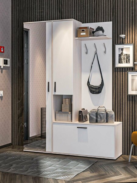Прихожая «Саша» - компактная и функциональная мебель, которая будет вас встречать и провожать каждый день. Вместительный шкаф для одежды вмещает 10 вешалок, тумба под коробки и мелочь с 4-мя полками, обувной отдел для 18 пар обуви, и важная деталь - зеркало, которое позволяет разглядеть себя в полный рост. Материл фасадов и корпуса качественный ЛДСП. Вариант сборки только как на фотографии (шкаф слева). Ширина пенала для одежда - 493 мм. Внутри располагается выдвижная штанга для одежды и две полки (сверху и снизу).
